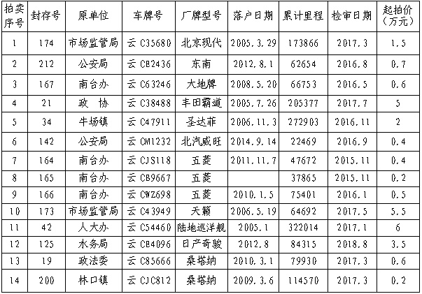 經(jīng)鎮(zhèn)雄縣人民政府批準,公開拍賣鎮(zhèn)雄縣公務用車改革取消車輛(第三期)14輛。相關(guān)事項如下: