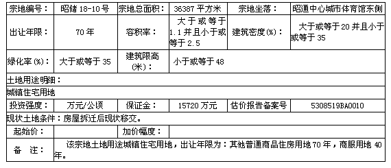 1.該宗國有建設(shè)用地使用權(quán)由昭陽區(qū)土地儲(chǔ)備交易中心委托昭通華龍拍賣有限公司拍賣。